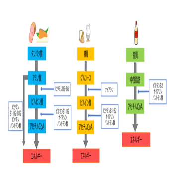 エネルギーのもとになる糖質、タンパク質、脂質が分解されたものの、ビタミンBがなければ代謝のスタートが切れないということになります。