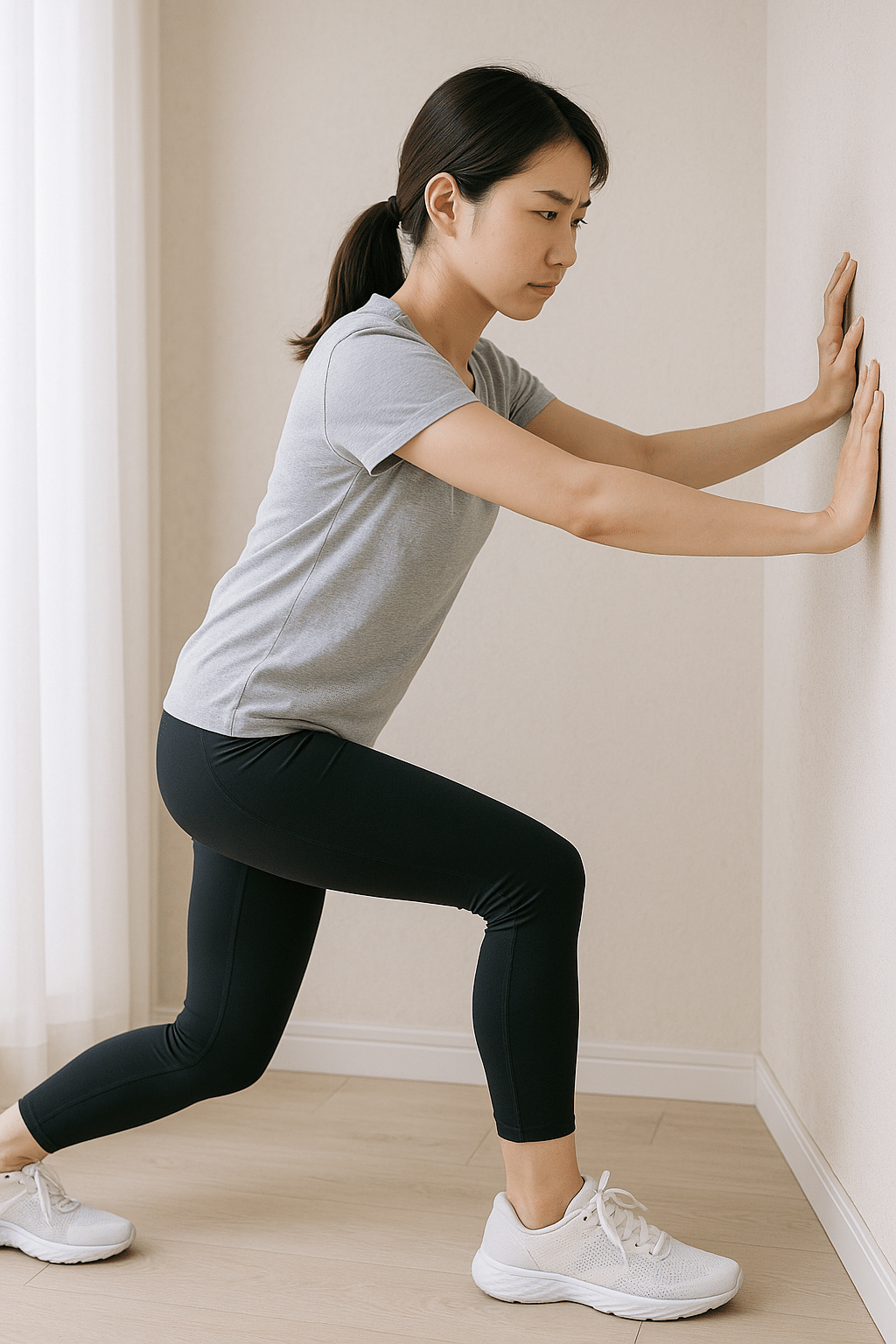 壁に手をつき、片足を後ろに引いてアキレス腱を伸ばす。ふくらはぎの張りを解消します。