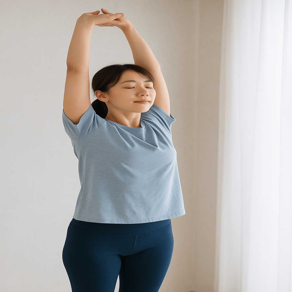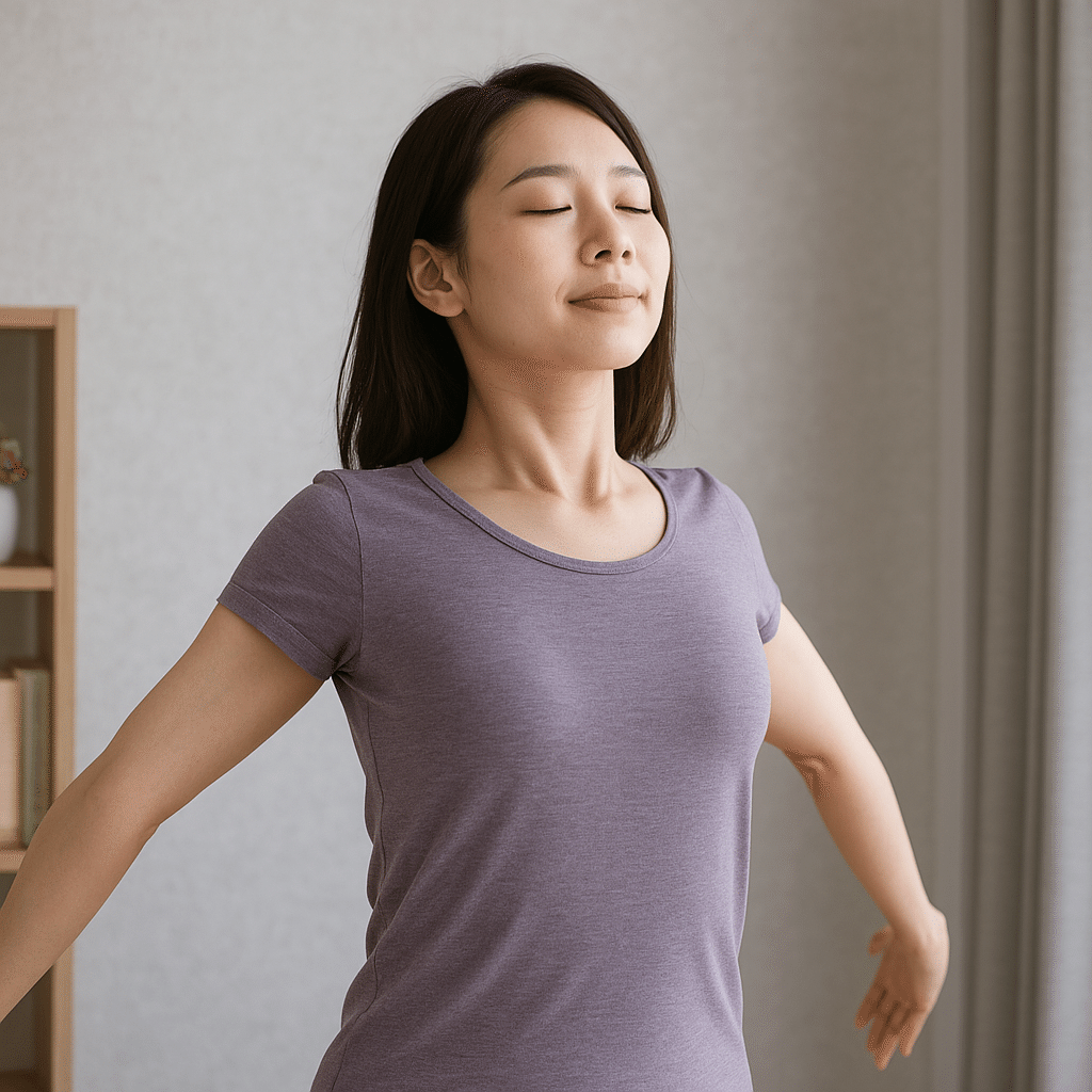 背伸び・肩甲骨まわし・胸ひらき呼吸・足首回しなど、簡単な動きで体は驚くほどラクになる