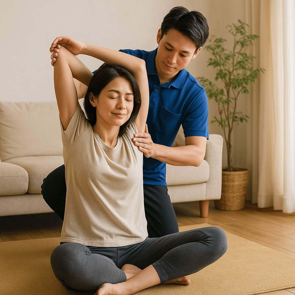プロのストレッチでは、トレーナーが体を安全に“他動的に”動かすことで、