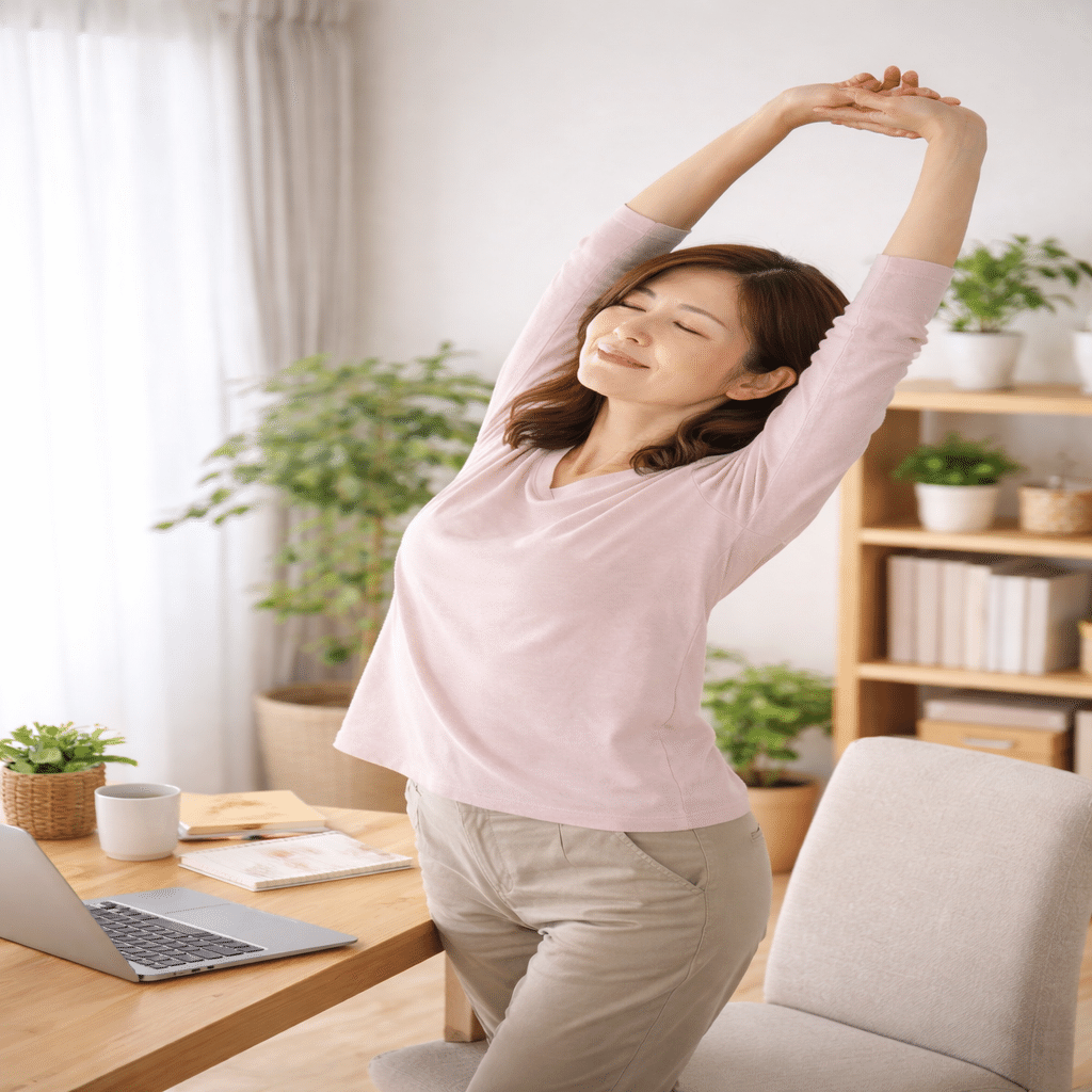 正しい姿勢も、長時間維持すれば疲れます。30〜60分おきに座り直す、立ち上がって歩く、肩や首を回すなど、小さな動きを取り入れてリフレッシュするのが大切です。