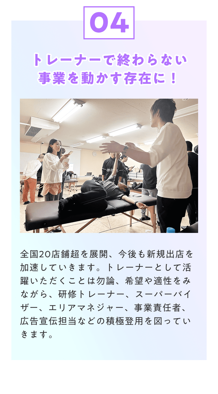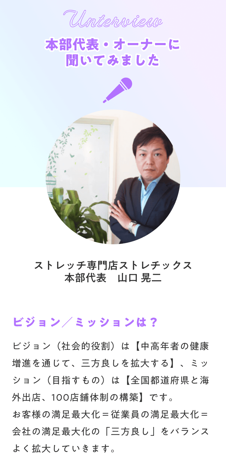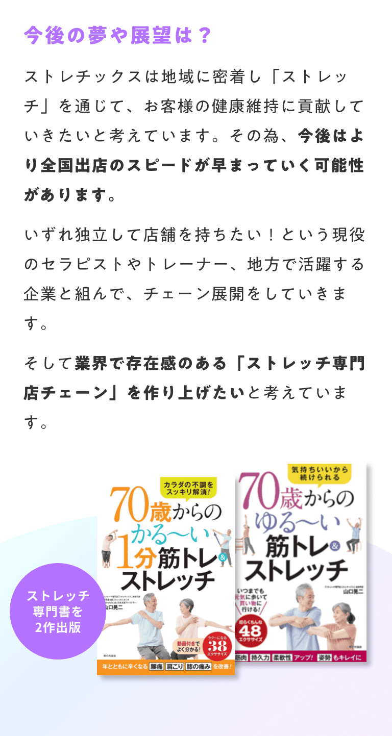 創業10年超、全国20店舗超、書籍2作、WEBサイトやYouTubeで健康&ストレッチ情報配信など、広く皆様の健康増進に貢献するブランドです。
