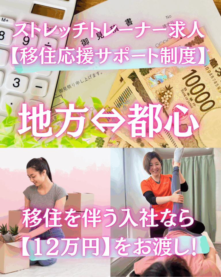 地方から一部エリア(東京、奈良、高知)の店舗勤務として転職・移住される方を応援するため、**「移住応援サポート制度(入社日12万円お渡し)」**を導入しています。家具家電の持込を伴う一人暮らし引越し費用は平均 7〜12万円前後。